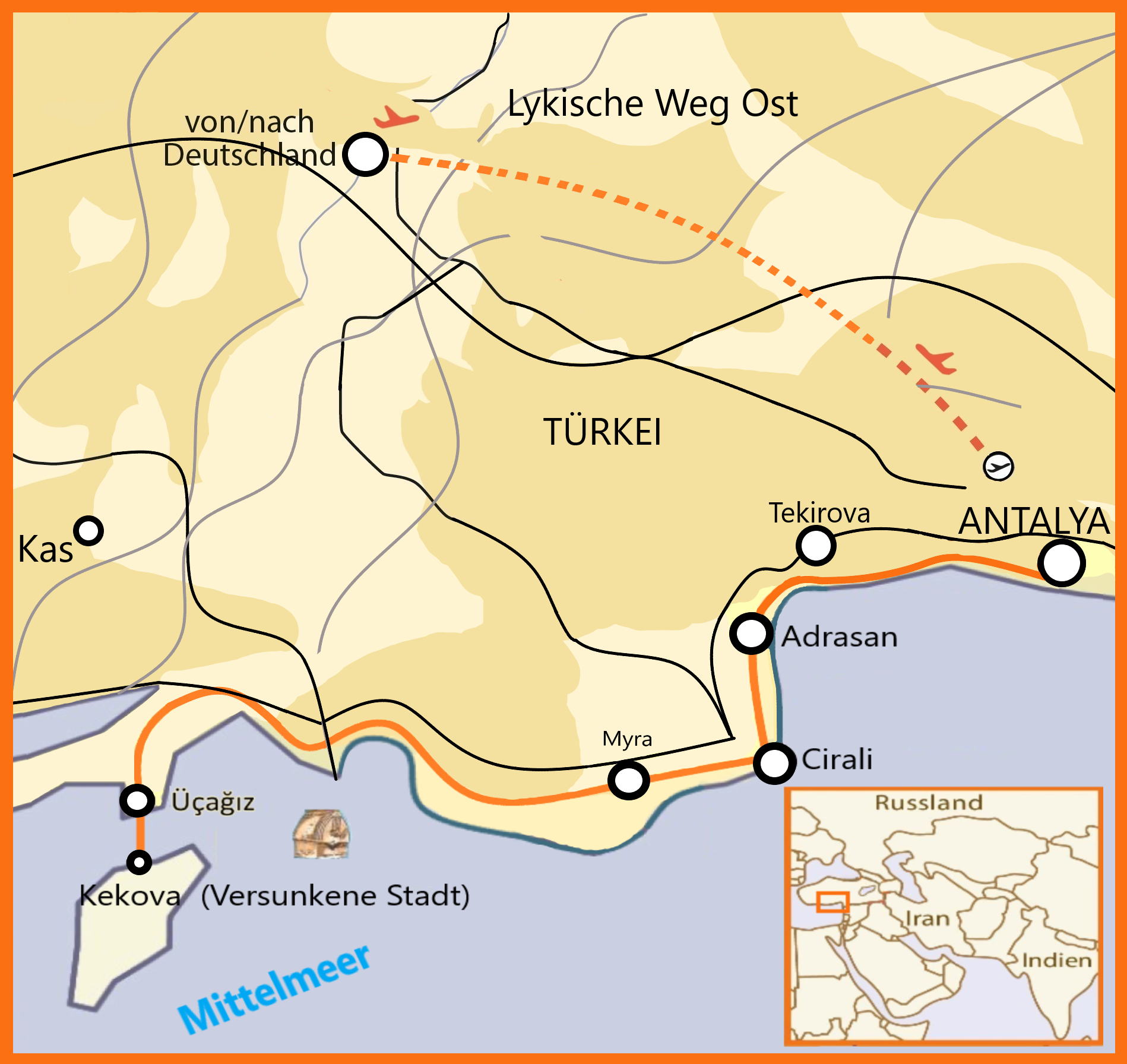 1. Tag: Flug nach Antalya Flug nach Antalya – Weiterfahrt nach Adrasan (1 ½ Std) Übernachtung im Hotel (1 Ü)